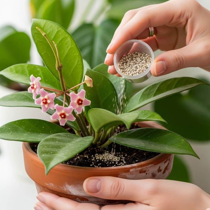 - Don’t Overdo It: Feed your Hoya only during the active growing season. Using a half-strength dilution every 3-4 weeks is sufficient. Over-fertilizing may damage the roots and completely halt the plant’s growth.