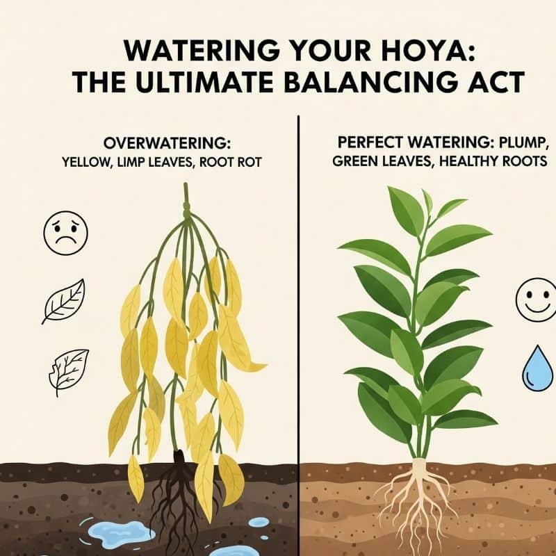 Hoyas are semi-succulent plants, capable of storing water in their thick, waxy leaves. The greatest danger to their health—and their blooming potential—is overwatering and the resulting root rot.